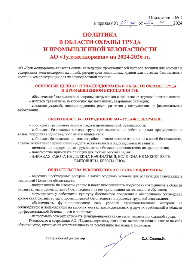Основные цели АО «Тулажелдормаш» в области охраны труда и промышленной безопасности:- обеспечение безопасности и здоровья сотрудников в процессе их трудовой деятельности;